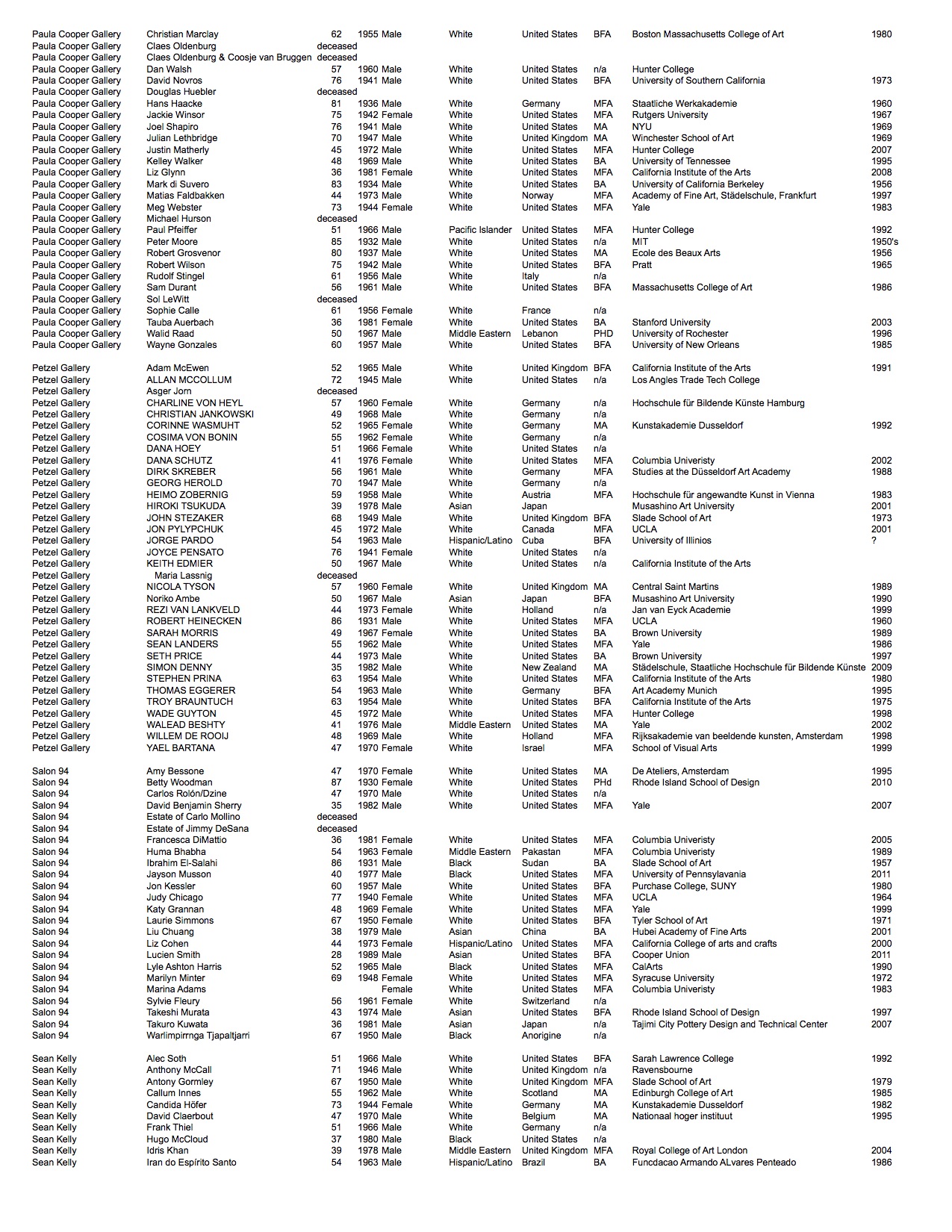We built a database of 1300 artists represented at the top 45 commercial galleries in New York. We researched each artist noting their: Age, Race*, Nationality, Gender*, and Education (highest degree, institution, and date of graduation).